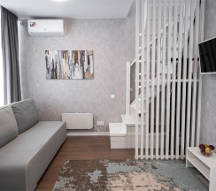Гостиная совмещенная с кухней на первом этаже и 2 отдельные спальни на 2 этаже, два санузла.