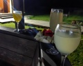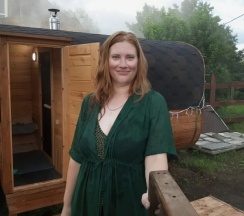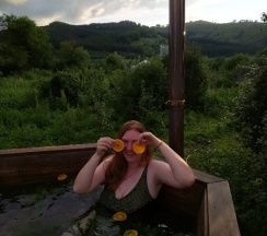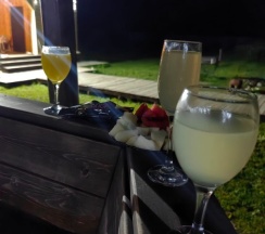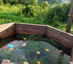 Дети играли в бассейнах, вечером заказывали тут же баньку с купелью и чаном. Под дождиком прикольно было в чане сидеть)