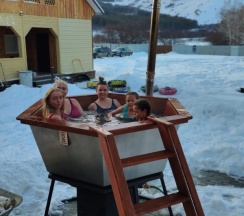 Расположение вдали от села. Вокруг природа, рядом речка, можно пешком пройти. Также рядом смотровая площадка "гора влюблённых". Нет шума машин и прочего это прям супер. Баня и чан это как часть развлекательный программы, дети и на следующий день просили продолжения.😁 Берите не пожалеете и будет чем занять вечер после дороги.