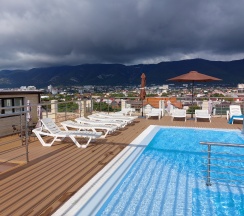 Красивый отель! Очень красивый вид с крыши бассейна на надпись "Геленджик". Номера чистые и уютные, в столовой очень вкусная еда всем советую
