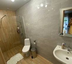 О номере: номер бронировали самый простой при этом комплекность была выше ожидаемого - просторная двуспальная кровать (люди с высоким ростом до 2 м оценят), раскладной диван (дополнительно можно разместить еще 2 человека, например детей, только о комплекте белья нужно будет договориться), шкаф для одежды и отделениями с хоз.пренадлежностями, раскладная сушка для белья, микроволновка, холодильник, телевизор, чайник, стол, стулья, посуда, репелленты, кондиционер. Есть аптечка с минимально необходимым набором медикаментов (аптеки в поселке нет, ближайшая - в Зеленоградске, это надо учитывать). Туалетная комната с душем очень просторная, электрополотенцесушитель, хорошая вентиляция. Ремонт в номерах свежий. Обслуживание дистанционное (по заявке менеджеру приходит горничная для уборки или, например, забрать вещи в стирку) . Рядом с номером на террасе расположен столик со стульями, можно попить чаю на свежем воздухе, почитать книгу в подвесном кресле или сделать шашлыки - есть несколько мангальных зон. В номере есть WiFi, но вечером, когда все постояльцы в номерах, скорости для потокового видео уже не хватает хотя переписываться и отсылать фотки с отдыха вполне комфортно.