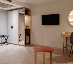 Комфортный номер, расположенный на первом этаже, для людей с ограниченными возможностями площадью 27 кв.м, который оснащен всем самым необходимым для комфортного пребывания. Полутороспальная кровать (120х200 см), шкаф, диван-кровать (дополнительное место), телевизор с плоским экраном, WI-FI, телефон для внутренней связи, вода бутилированная, чайная станция, безбарьерная душевая, полотенца, бесплатные косметические принадлежности, фен, гладильные принадлежности