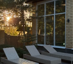 Домики все с террасой что радует, теплый бассейн для зимних вечеров очень к месту, так же есть сауна с бильярдом идеально - для большой компании) особую атмосферу поймали у костра