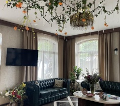 Уютная гостиная на 1 этаже, где утром просят завтраки, а вечером можно собраться с друзьями и разогреть еду и попить чаю.