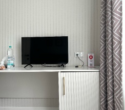 Уютная ,комфортная гостиница,новый ремонт,приветливый персонал,бронировали за сутки до приезда и нам достался 2х комнатный номер 50кв ,в номере есть холодильник,телевизор,фен,тапочки,полотенца,тарелка,стаканы,вилки и салфетки.