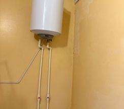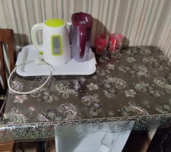 Горячая вода с титана, возможность включить обогреватель, если прохладно. В номере чайник, холодильник.
