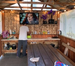 Еще на общей зоне кухни есть проектор, есть караоке, большой телевизор. На территории несколько зон отдыха: беседка, веранда, подвесные качели, батут, лавочка-качель возле прудика, пляж с шезлонгами и зонтами, присесть и полюбоваться можно на каждом углу, всего даже не перечислить… Детям и животным просто раздолье)))