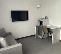 Отель очень понравился! Чисто и есть все необходимое- микроволновка, чайник, большой ТВ, сендвичи и пряники на завтрак, кулер и утюг на первом этаже. Также необычно, что администрация удалённая, ресепш здесь нет. Вход в отель и в номер по коду👍