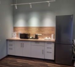 холодильник, варочная панель, посудомоечная машина, стиральная машина, вентиляторы, микроволновая печь, чайник, гладильная доска, утюг, комплект посуды для приготовления и сервировки.