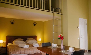 Оборудована двухспальной кроватью, и ещё одним двуспальным местом на втором уровне номера, кондиционером, LED телевизором. В ванной просторная душевая кабинка, фены, зубные наборы, шампуни, гели для душа, махровые халаты, чайная станция, холодильник, микроволновка.