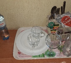 В номере есть посуда, микроволновка, холодильник, чайник, чай, кофе, фен, ложка для обуви и пр.