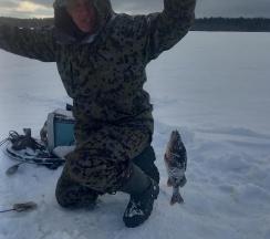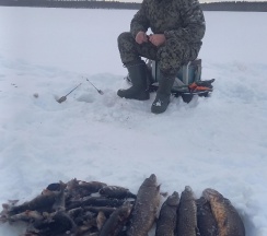 Отдыхали с 10 по 14 марта . Подгадывали погоду , но у природы свои законы . По приезду стало гораздо холоднее , но намеченные цели неизменны . Ловили в заливе на реке и на озере . Рыбалка трудовая была , но на жарёху и уху поймали в первую рыбалку . 1 день провели на заливе с солнышком с удочкой и надеждой на улов . А вот последний день порадовал нас уловом 6 щук , 2 налима и 7 десятков хороших окуней .