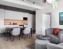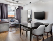 2. Очень продуманный номер, много мебели (в спальне стол круглый, 2 мягких стула, кресло с подставкой под ноги; в гостиной диван раскладной с орто.матрасом- полноценное спальное место на 2 человек, кресло, стол журнальный и пуфик; в кухне стол и 2 мягких стула; в зоне входа большой шкаф).