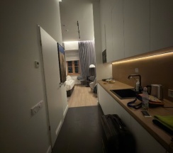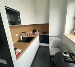 4. Кухня полностью укомплектована, есть все кроме посудомойки: большой встроенный холодильник и морозилка, микроволновка, варочная индукционная поверхность, чайник, тостер, стиральная машинка (!) набор посуды на 2 человек- кружки, стаканы, тарелки 3 видов, столовые приборы разные, прочие кухонные принадлежности включая штопор и кух.ножницы.