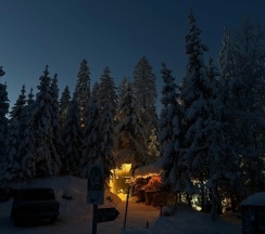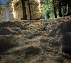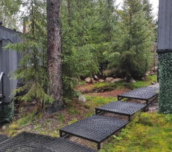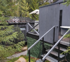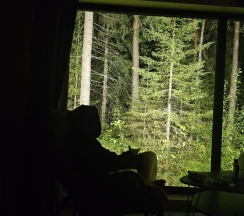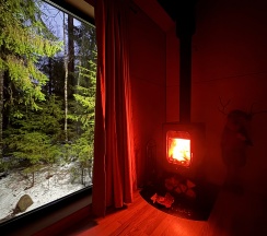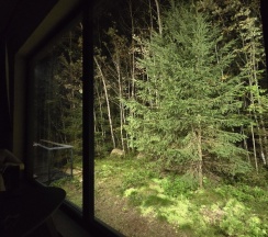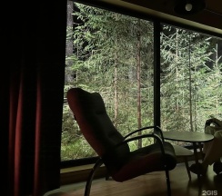 Панорамное окно, это наверное главная фишка анттилы, приятный вид из окна на лес, жаль, не пронаблюдали зверушек, только пару птичек. Кстати, местность у панорамного окна освещена сильной подсветкой, которая управляется из дома. Вообще, в доме много ламп и выключателей, даже запутываешься в них. Также есть подсветка зоны с мангалом и купелью.