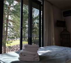 мы воспользовались обеими возможностями. Бытовые условия в коттедже прекрасные: тепло, чисто, действительно стильно, есть вся необходимое для готовки,в нашем коттедже было 2 комфортные спальни и Каждая с прекрасным видом через панорамные окна.