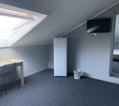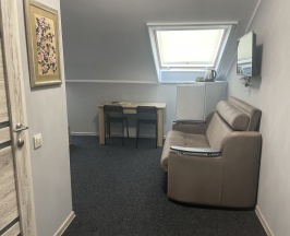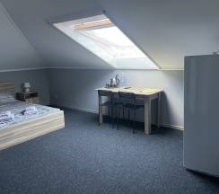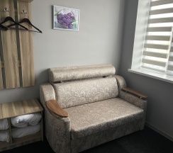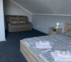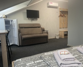 Мансардный номер на втором этаже основного здания. Двуспальная кровать и полноразмерный диван. Все удобства.