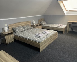 Мансардный номер с двуспальной кроватью и двумя односпальными кроватями. Все удобства