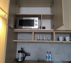 Замечательный отель! Уютно, все идеально чисто!-за это отдельное спасибо- все натерто: сантехника, зеркала, стекла душевой, посуда чистая, пыли нет, волос тоже, полотенца, халаты и постельное идеально белое и наглаженое! .. есть кондиционер, 2 бутылочки воды, по 2 пакетика чая(черный, зеленый и кофе), меню на выбор ко времени, которое укажешь, вареный кофе есть. Заказывала номер двухместный, но на одного человека. счастлива, что положили по 2 комплекта для душа и полотенец, тк у меня длинный волос и пакетика шампуня мне не хватило, а 2 в самый раз, ну и полотенце пошло одно на волосы, второе для тела) спасибо большое! Рекомендую 👍