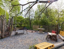 На территории есть мангал и просто место, где можно посидеть вечером с чаем и послушать треск костра. Также есть качели и гамак, с которых не хотелось вставать)