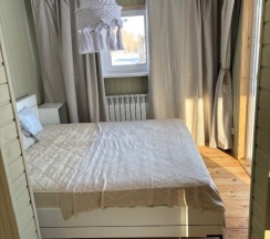 Есть каминная печь на дровах, обеденный стол, большая двуспальная кровать и полутораспальный диван.