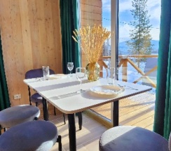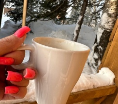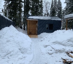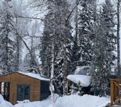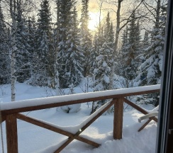 Очень уютный деревянный домик в заснеженном лесу. Гостили три ночи, все очень понравилось. Тишина, чистый воздух, приветливые доброжелательный хозяева. В домике есть все необходимое - посуда, плитка, холодильник, микроволновка, фен, телевизор, теплые полы - все отлично работает. Очень понравился хороший напор горячей воды, никаких перепадов температур, пока принимаешь душ, и также хорошо уходит вода, не застаивается. Хорошее расположение - до горы пять минут на машине, до магазинов также. На фото вид из домика.