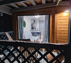 Отдельно стоит упомянуть местоположение дома — оно идеально подходит для тех, кто хочет насладиться природой и при этом оставаться недалеко от всех основных достопримечательностей курорта. Вокруг дома природа просто завораживает: свежий воздух, красивые пейзажи и пение птиц создают идеальную атмосферу для отдыха. Огромные панорамные окна и гирлянды на веранде, это отдельный вид искусства этих домов!