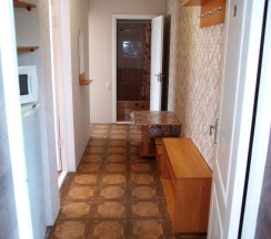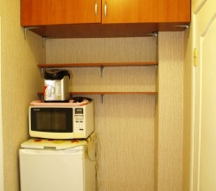 В коридоре : микроволновая печь, холодильник, электрический чайник, столовые приборы, кружки и тарелки, стол и стулья.