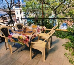 Имеется большая терраса со столом, стульями, холодильником, СВЧ-печью, термопотом и кухонными принадлежностями.
