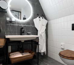 – ванная комната с душевой кабиной, фирменный банный текстиль, тапочки, фен, косметический набор;