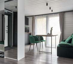 «Полулюкс» — дом для комфортного отдыха на природе. Он идеально подойдет и для отдыха на выходных, и для длительного проживания. Рассчитан на компанию от 2 до 6 человек, при необходимости можно арендовать детскую кроватку. Отличительная черта — оборудованные кухня.
