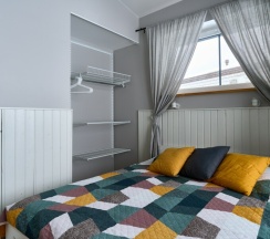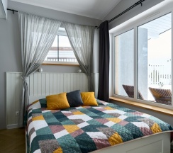 Уютный апартамент класса комфорт + с двумя отдельными спальнями и гостиной зоной. Подойдет для комфортного отдыха семьи с детьми, 2-х семей с детьми, компании друзей. Панорамное остекление фасада, терраса. Каждый апартамент оснащен - финская сауна, лаунж зона для детей, полностью укомплектованная кухня, стиральная и посудомоечная машина, телевизор Smart-TV, холодильник, микроволновая печь, кофеварка, чайник, варочная панель, кондиционер.
