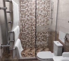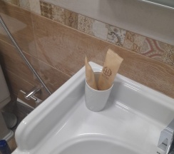 В ванной комнате - зубные щётки, паста, мыло, гель, шампунь, халаты, одноразовые тапочки =всё это есть.