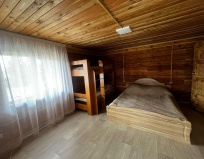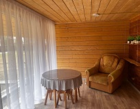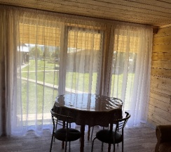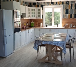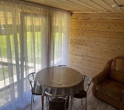 Большой дом на 9 мест вообще шикарный: 3 комнаты и гостиная-кухня с новой мебелью и санузлом. Из дома есть крытый выход на веранду с большим столом, которая относится только к этому дому, т.е. других отдыхающих там нет. Очень удобно.