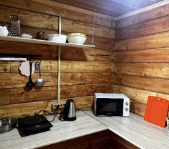 Номеров без благоустройства, которые пользуются общей беседкой, всего 3. Это не создаёт толкотни. В беседке все необходимое есть: плита, раковина с горячей водой, микроволновка, наборы посуды, чистые кухонные полотенца, 2 холодильника.