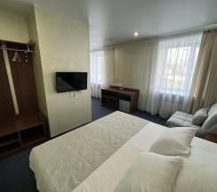 Кровать 160 см., сан.узел в номере, телевизор, холодильник, сплит-система, диван, стол.