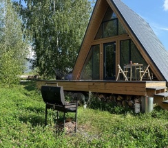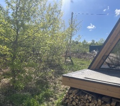 Красивая территория , уютный домик (снимали А фрейм) . Спать наверху было немного душно, но хорошо что окно открывается