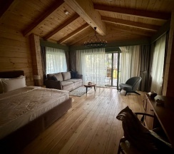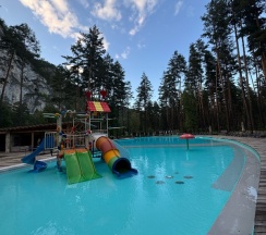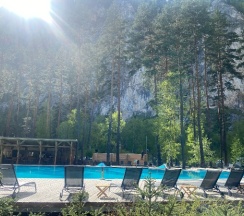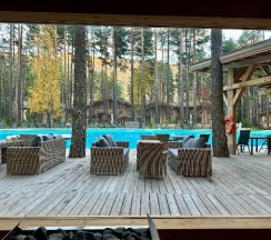 Территории красоты фантастической, много зелени, шум реки, прозрачный воздух, очень много мест, где можно просто остановиться и насладиться этой красотой, все продумано до деталей. На территории открытый бассейн, с баром и теплой сауной.с панорамным окном.