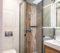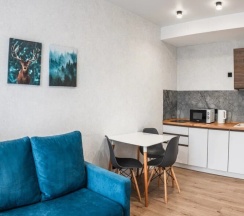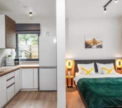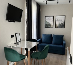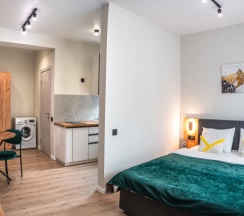 В апартаменты может расположиться до 3-х человек. В студии есть спальная зона с двуспальной кроватью, кухонная зона, есть кресло –кровать, отдельно оборудовано место для хранения и сушки горнолыжного инвентаря.