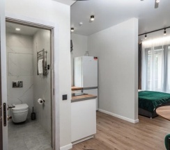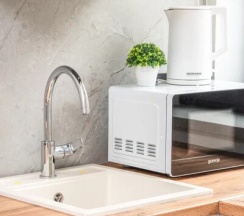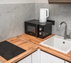 В студии есть все необходимое для комфортного проживания: телевизор Smart tv, микроволновка, электрический чайник, кухонный инвентарь, теплые полы по всему периметру.