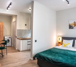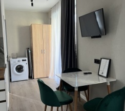 Обстановка в студии создана таким образом, чтобы вы чувствовали себя как дома. Вам предоставляется все необходимое для комфортного проживания: телевизор Smart TV, микроволновка, электрический чайник, холодильник, стиральная машина, фен, а также полный набор кухонного инвентаря. Чтобы вам было действительно тепло и уютно, в студии установлены теплые полы по всему периметру. А с балкона вы сможете наслаждаться видом на горы.