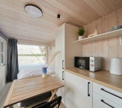 Домики просто великолепные, внутри тепло-пахнет деревом , панорамные окна, все продуманно до мелочей- вся посуда, тряпочки, средства, полотенца, приборы!