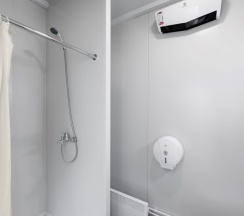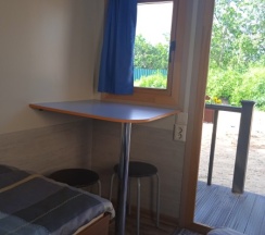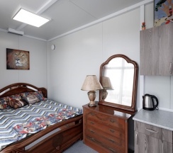 В домике две односпальные кровати + спальное место на втором ярусе массой до 50 кг. Теплый санузел душ и кухня находятся в главном корпусе в 20 метрах от домика.