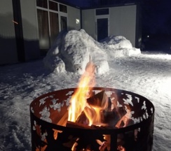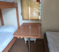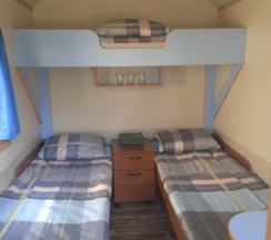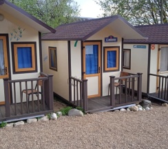 В домике большая двухспальная кровать + односпальная кровать + два спальных места на втором ярусе массой до 50 кг каждое. Санузел и душ находятся в главном корпусе в 20 метрах от домика.