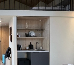 Минус — кухня маленькая, набор посуды ТОЛЬКО на двоих. Приготовить что-то нереально: нет ни плиты, ни (!) микроволновки. Последнее изумило. Если ты не хочешь переплачивать за кафе или приехал вечером, когда оно закрыто — всё. Можешь только пить вино с шоколадом или чай с нарезками. Даже условную пиццу не разогреть. Это странно за прайс 12К в несезон