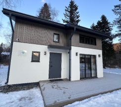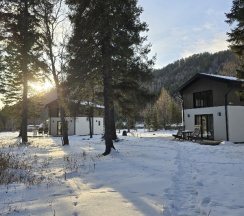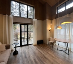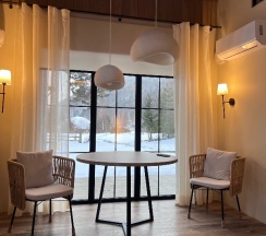 Очень красивый дом «У ручья» 😍 Были в несезон, в конце октября, шел легкий снежок — при этом в доме оооочень тепло! Спокойно открыли окна для циркуляции воздуха, и никаких проблем, полы теплые. Это огромная редкость для гостевых домов