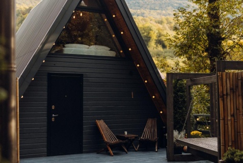 Дом A-frame с террасой для 4 гостей. В доме двуспальная кровать и раскладной диван. Кухня с обеденной зоной, оборудованная всей необходимой техникой и посудой: холодильник, микроволновая печь, электрический чайник. Ванная комната с душем и феном. Гостям предоставляются туалетно-косметические принадлежности, постельное белье, полотенца и тапочки.