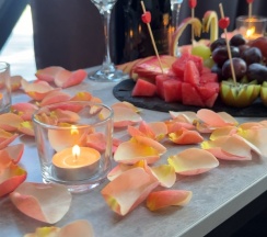 Зажженные свечи и лепестки роз были аккуратно выложены под теплым светом свечей.