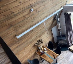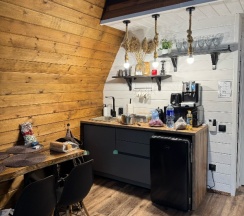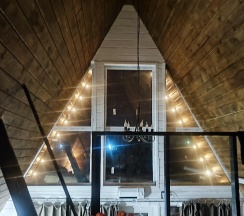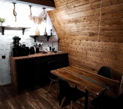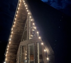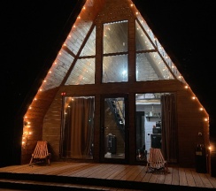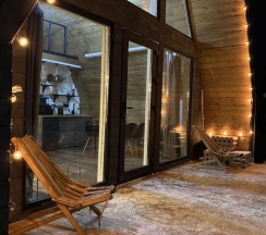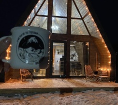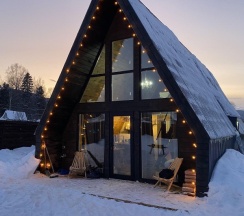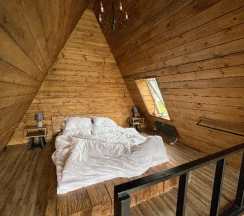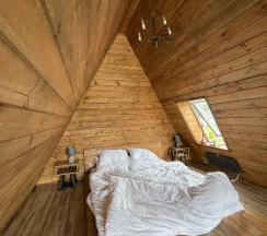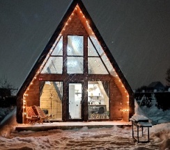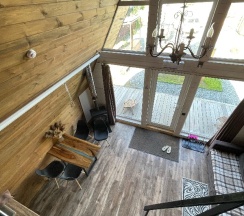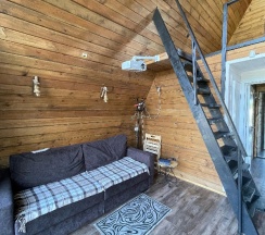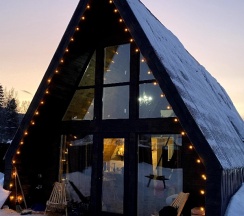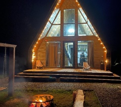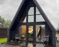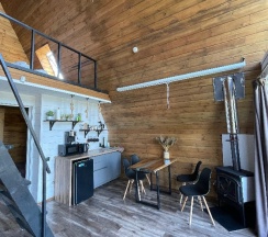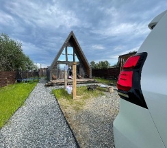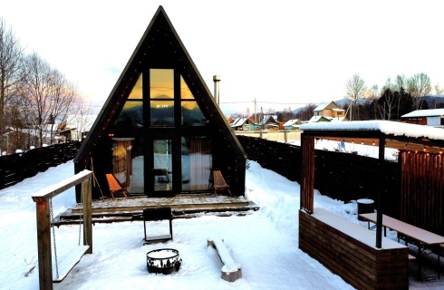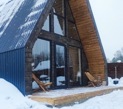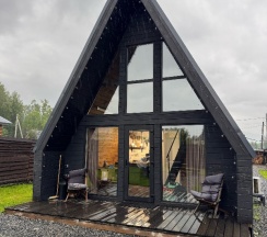 Отличный А-фрейм домик, мы были в 5м, места достаточно, необходимая посуда имеется. Все красиво оформлено, в ванной есть ватные диски и ватные палочки, что большой плюс. Цена адекватная, 6 спальных мест, большой диван. Бесконтактный доступ.