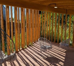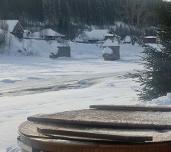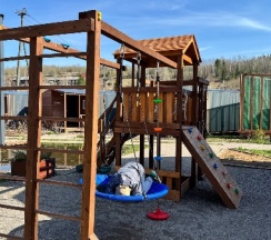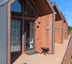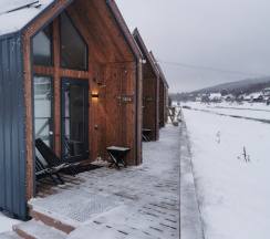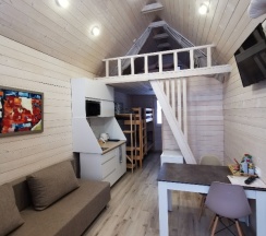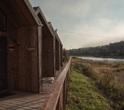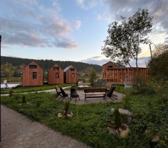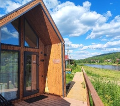 Домики в стиле барнХаус, новенькие, оснащены всем необходимым. Есть баня, чан с видом на реку, детская площадка, качельки, прокат великов